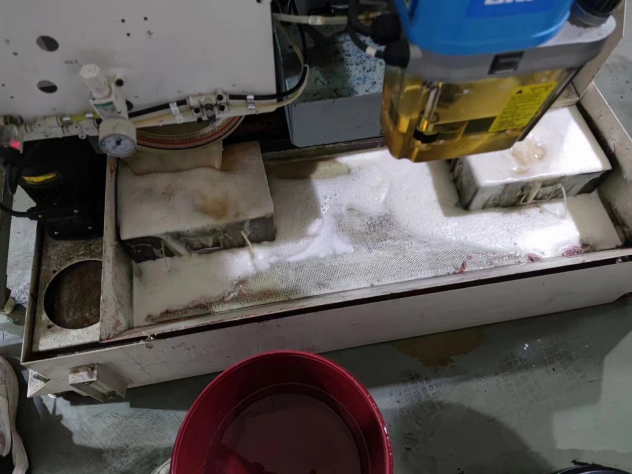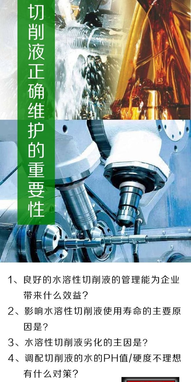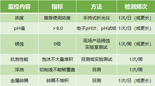 對沒有異味、使用正常的機(jī)床進(jìn)行維護(hù),將切削液上的浮油、切屑及其他雜物徹底清理干凈,將加入原液使切削液濃度在正常使用濃度基礎(chǔ)上提高 4-6個點(diǎn)的濃度,并按照工作液體積0.1%的比例加入殺菌劑,循環(huán)均勻。